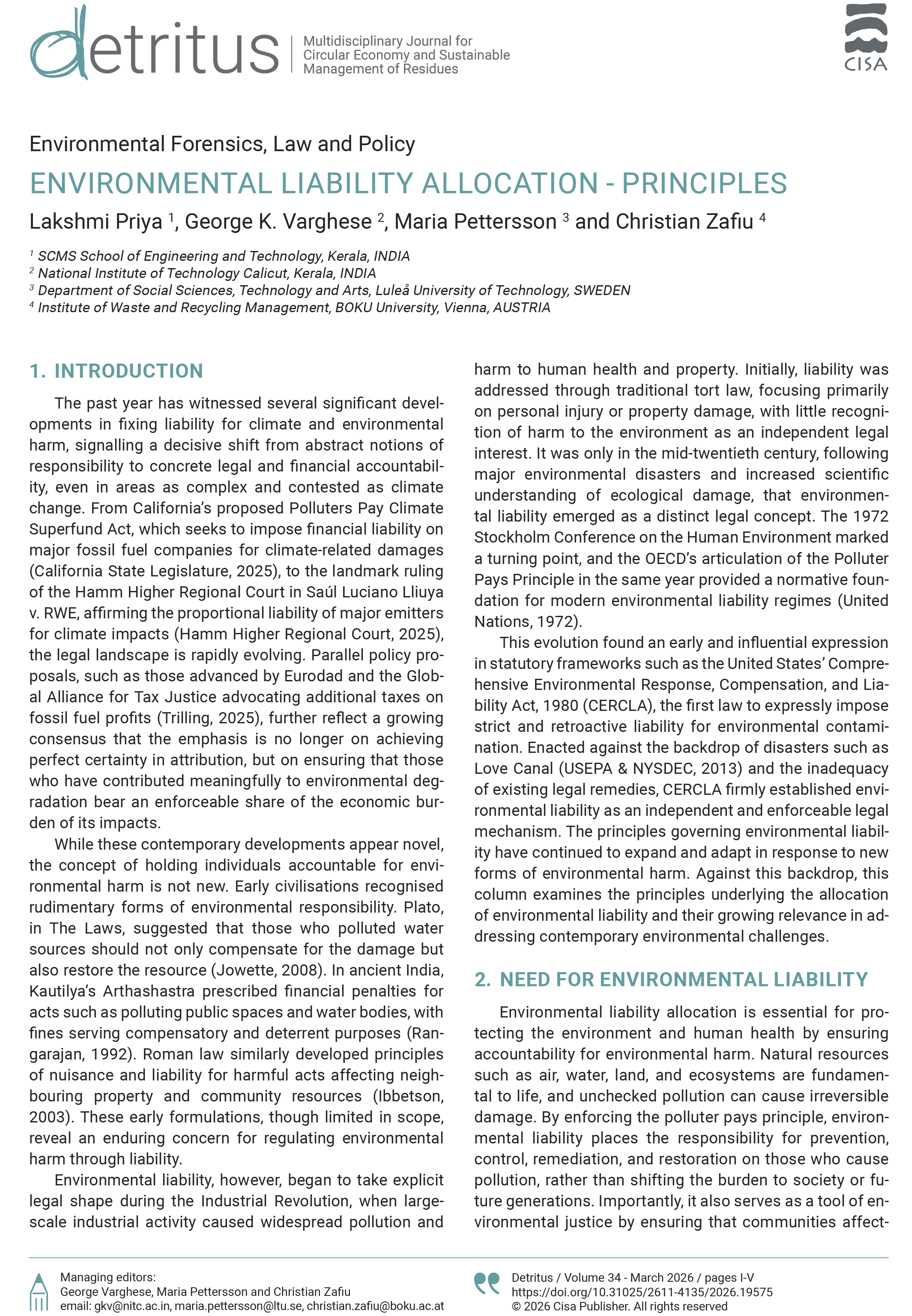 The column “Environmental Forensics, Law and Policy” is dedicated to examining how scientific methods and advanced technologies are applied to investigate, detect, and attribute environmental offenses. The column highlights the role of environmental forensics in supporting enforcement, accountability, and evidence-based decision-making, while also critically engaging with the legal frameworks and policy responses that govern pollution control and environmental protection.
